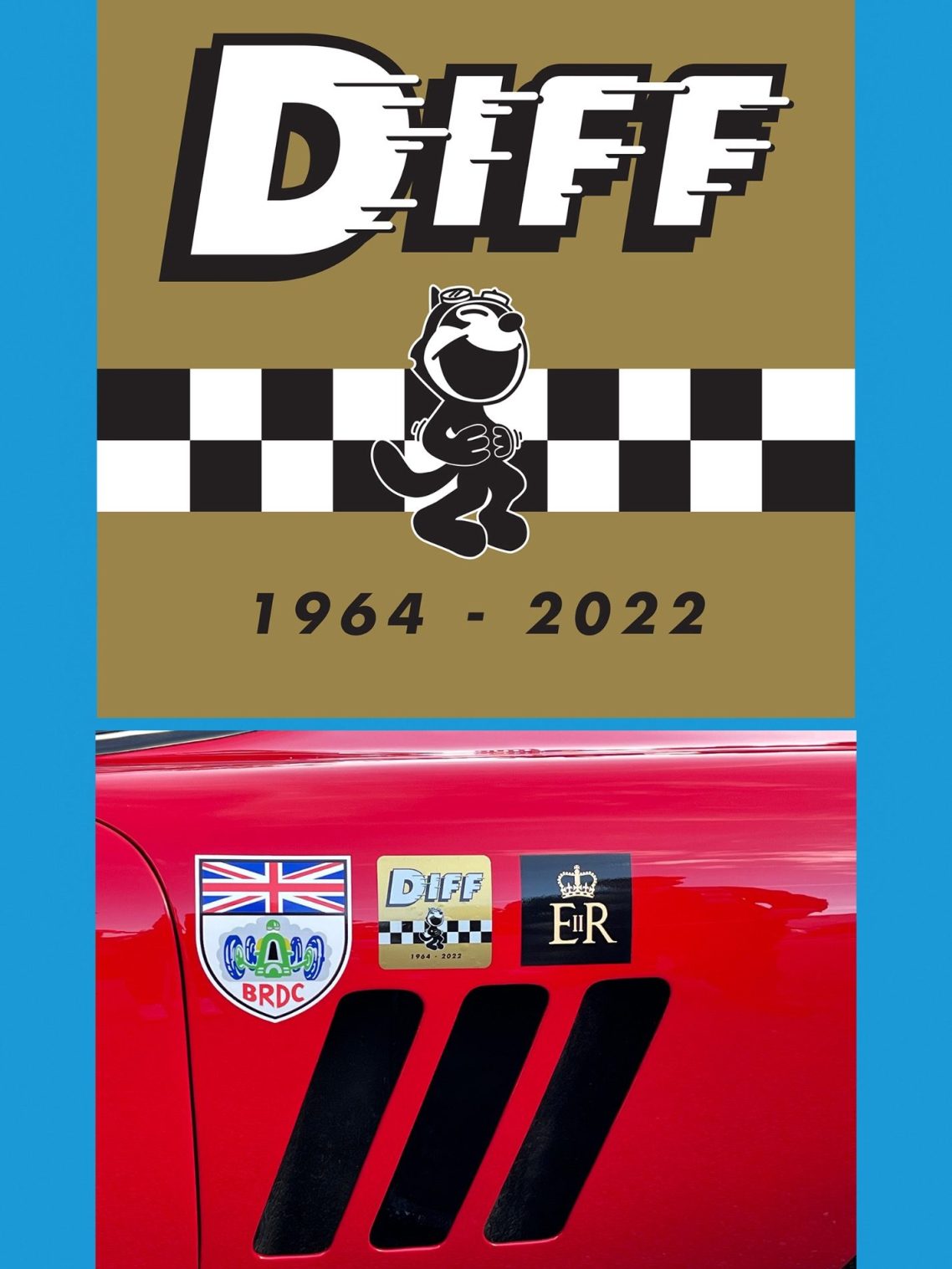 This inspired Sarah, and with the help of friend and graphic designer Julian Balme of Vegas Design, together they created the memorial ‘DIFF sticker’ in a Black and Gold Livery, paying homage to Simon’s first love of Historic Lotus F1 Cars.